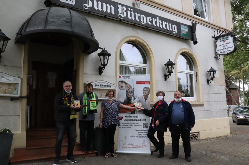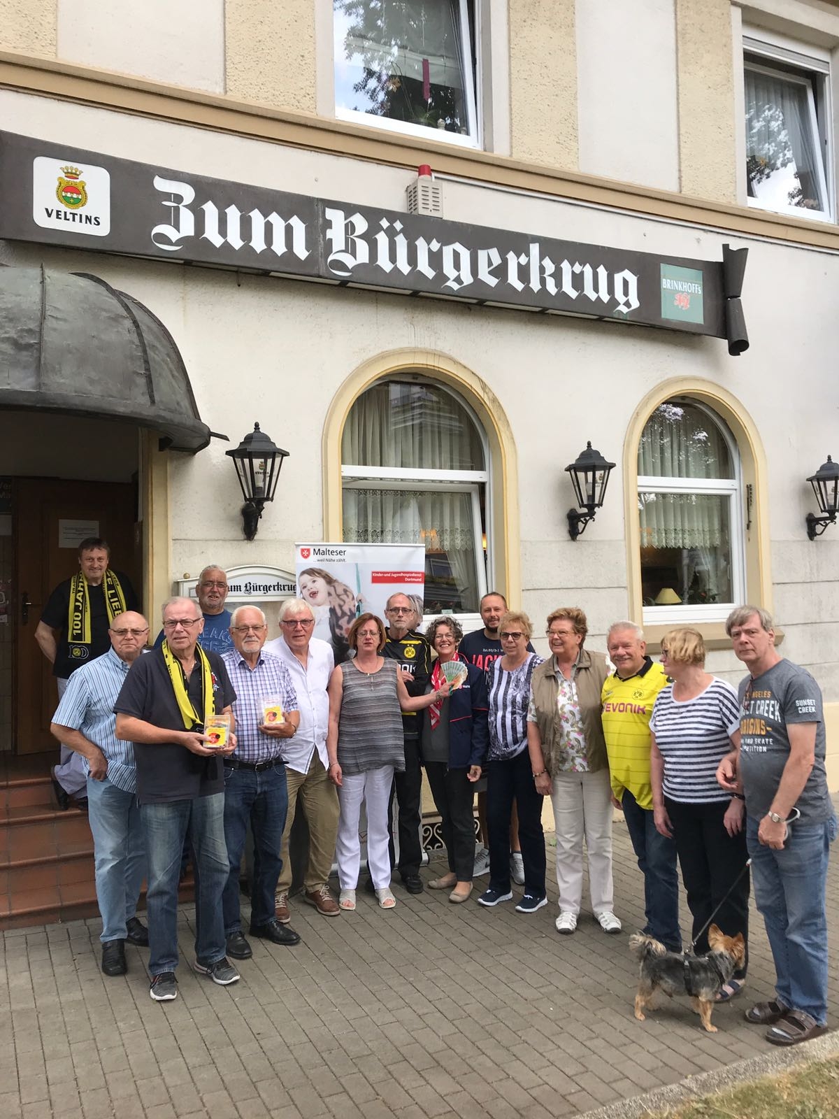 Juli 2023: Ein neues Rekordergebnis hat die Tipprunde im Restaurant Zum-Bürgerkrug in Dortmund Asseln zugunsten des Malteser Kinder-Hospizdienstes zusammengetippt. Die Tippgemeinschaft tippt alle Bundesliga- und Pokalspiele des BVB, die Hälfte des Einsatzes geht immer an den Kinder- und Jugendhospiz-Dienst der Dortmunder Malteser. Im zwölften Jahr der Aktion kamen diesmal 1449,25 zusammen, das zweitbeste Ergebnis bisher. Zusätzlich konnten 300 Euro einer persönlichen Einzelspende übergeben werden, so dass sich Heike Breitrück und Karin Fieberg von den Maltesern über 1749,25 Euro freuen konnten. „Eine beeindruckende Summe, und das mit dieser Gleichmäßigkeit. Wir sind schwer beeindruckt.“, so Frau Breitbrück, die dieses Jahr das erste Mal die Spende abholen durfte. Das Wirte-Ehepaar Peter und Kornelia Berger übergaben die Spende zusammen mit einigen der Spender. Sehr gefreut haben sich die Malteser auch über die Ankündigung, dass es im Winter eine Sonder-Aktion Winter-Glühen geben wird, deren Erlös ebenfalls den Maltesern zu Gute kommen wird. |