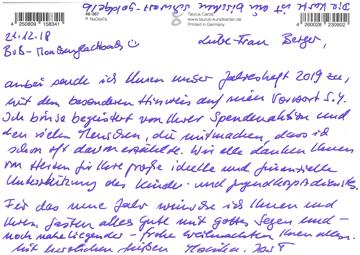 Weihnachtsgrüße kamen kurz vor Weihnachten von den Maltesern: Persönlich bedankte Sich Frau Jost für die erfolgreiche Spendenaktion: Liebe Frau Berger! Anbei sende ich Ihnen unser jahresheft 2019 zu, mit dem besonderen Hinweis auf mein Vorwort Seite 4. Ich bin begeistert von Ihrer Spendenaktion und den vuielen Menschen, die mitmachen, dass ich schon oft davon erzählte. Wir alle daken Ihnen von Herzen für Ihre große ideelle und finanzielle Unterstützung des kinder- und Jugendhospizdienstes. Für das neue Jahr wünschen wir Ihnen und Ihren Gästen alles Gute mit Gottes Segen und - noch naheliegender - Frohe Weihnachten Ihnen allen. Mit herzlichen Grüßen Monika Jost Das Jahresheft können Sie hier herunterladen.. |